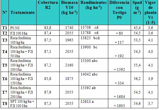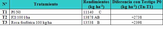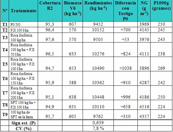 En San Antonio de Areco, las diferencias de rendimiento no fueron significativas (P=0,639). Aún con esta salvedad, los tratamientos ensayados permitieron elevar los rendimientos en alrededor de un 10 % (Tabla 4) a excepción de la roca fosfórica que, puesta de manera aislada, no mejoró el rendimiento ni otros parámetros de cultivo a causa de su baja solubilidad. Las mejores estrategias combinaron la aplicación de roca fosfórica más el fertilizante líquido a la dosis de al menos 100 lha-1. En general, este buen comportamiento guardó relación con una elevada acumulación de biomasa en estadíos tempranos y con alto NG.