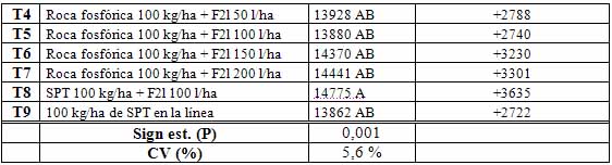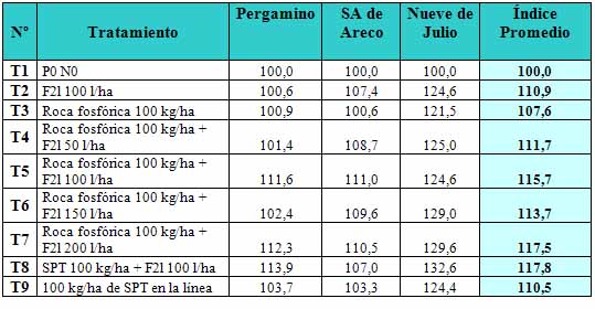 En la Tabla 6 se presenta el rendimiento relativo (RR) de cada tratamiento, calculado como RR Tn= Rendimiento Tn / Rendimiento T1 x 100. De esta manera, se pueden promediar los rendimientos de las tres localidades, asignando igual peso a cada sitio independientemente de su rendimiento absoluto. La respuesta a la fertilización fosforada como práctica fue del 11,7 %. Todos los tratamientos mostraron ventajas con relación al testigo, aún la roca aunque en menor magnitud con relación al resto. Con pequeñas diferencias sobre el resto, los tratamientos T8 (SPT 100 + F2L 100) y T7 (Rf 100 + F2L 200) fueron los de mejor comportamiento. Estos tuvieron en común aportar una dosis alta de P.