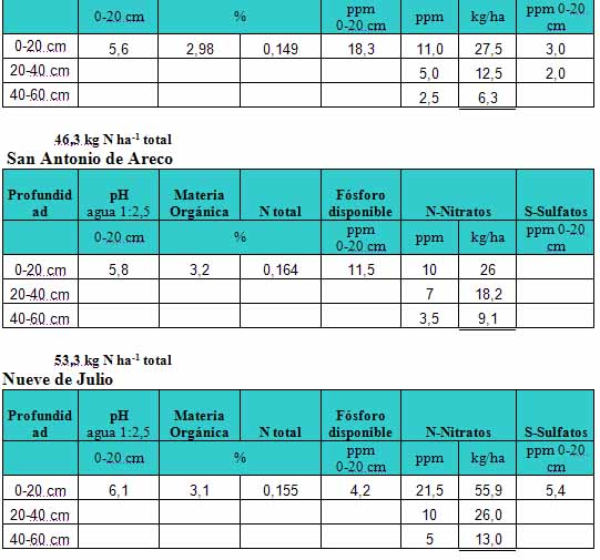 Las fechas de siembra de los ensayos fueron: el día 24 de Setiembre en Pergamino, con antecesor trigo/soja, utilizando el híbrido Nidera Ax 878 MG SD. En San Antonio de Areco se sembró el día 30 de Setiembre el híbrido Advanta 8319MG. En 9 de Julio, se sembró AW 190 MGRR2, el día 3 de Noviembre en labranza mínima. Por su parte, los análisis de suelo del sitio experimental se presentan en la Tabla 2. Se destaca un nivel de Materia orgánica y N normal, bajo de P y muy bajo de S.