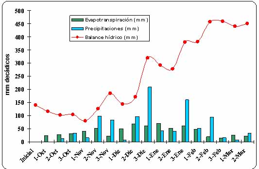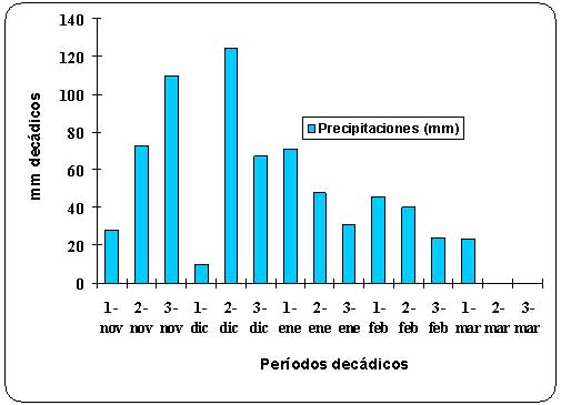 Figura 3: Precipitaciones decádicas (mm) en el sitio experimental. Nueve de Julio (Bs As), durante la campaña 2009/10. Precipitaciones totales durante el ciclo 698 mm.
