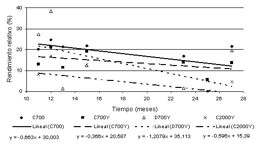 incrementos de rendimiento. El rendimiento relativo al testigo señala como