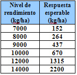 Figura 5: Relación entre respuesta a Potasio (K) y rendimiento del tratamiento fertilizado con NP(S)K aplicado al voleo a la siembra del cultivo. Se retiraron del análisis los sitios Pergamino (2007) y 9 de Julio (2007), con respuesta negativa sin explicación aparente. La tabla adjunta indica la respuesta esperable al K para cada nivel de rendimiento, considerando la función inserta en la figura.