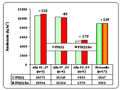 El S fue el nutriente que permitió alcanzar los mayores incrementos de rendimiento, siendo la respuesta media de 622 kg ha-1. Las diferencias entre PSN y PN fueron significativas (P<0,05) en 5 (20) sitios. En las localidades de Arrecifes, La Trinidad, Pergamino (año 2006) y Chivilcoy (año 2007) la respuesta a S no fue significativa pero sí importante en términos cuantitativos, superando a la diferencia media observada en la red.