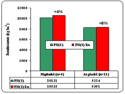 Numerosas experiencias en la región han posicionando al Zn como uno de los nutrientes no tradicionales con mayor expectativa de respuesta en maíz (Ferraris et al., 2007). Sin embargo, en la presente red quedó confinada al primer año de ensayos, y sobre suelos Hapludoles (Figura 6). Estadísticamente, los incrementos por Zn fue significativos (P<0,05) en 3 (17) sitios, localizados preferentemente en el centro-oeste de la región: Chivilcoy, La Trinidad y 9 de Julio. Además, se observó una diferencia de rendimiento por sobre el promedio en Mercedes y Chivilcoy 2.