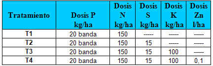 Las fuentes fertilizantes utilizadas fueron superfosfato triple de calcio (0-20-0), Urea (46-0-0), sulfato de calcio (0-0-0-18S), cloruro de potasio (0-0-0-50K) y zinc organoquelatado (0-0-0-10Zn) agregado sobre semilla.