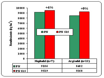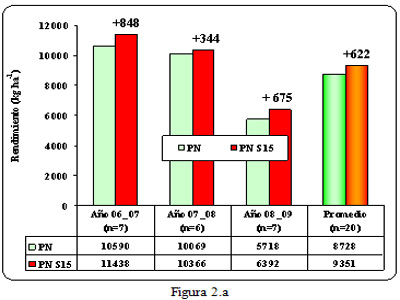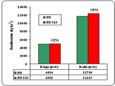 En la Figura 2 se presenta los rendimientos de las parcelas testigo y fertilizadas con S, separados por año (Figura 2.a), tipo de suelo (2.b) y nivel de rendimiento (2.c). El S es un nutriente móvil cuya respuesta se incrementa al aumentar la demanda, la cual a su vez se relaciona positivamente con los rendimientos medios (Ferraris et al., 2007.a). Esto explica el mayor nivel de respuesta observado en la campaña 2006/07, climáticamente más favorable, y en los ambientes de rendimiento alto. Además, se observó mayor respuesta en suelos Argiudoles, con respecto a los Hapludoles. Esto podría deberse a la mayor historia agrícola de los primeros, lo cual trae aparejado una caída en los niveles de MO labil, principal fuente de suministro de S a los cultivos.