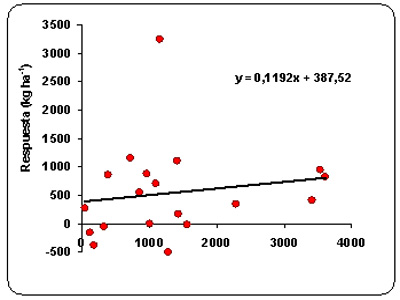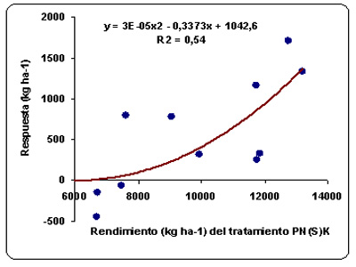 Por otra parte, si se retiran del análisis dos sitios con respuesta negativa importante y, a la vez, poco explicable, se observa una asociación positiva entre la respuesta a K y el rendimiento del tratamiento (Figura 5). Ante una elevada demanda por parte del cultivo, es posible que el suelo no logre abastecerlo en ausencia de fertilización, aún conteniendo una dotación suficiente de K. Una tendencia en igual sentido observaron Salvagiotti et al., (2006), en una red con diferencias significativas en sólo 1 (19) sitios. Dada la escasa información disponible en esta temática, esta hipótesis deberá ser testeada antes de recomendar aplicaciones generalizadas del nutriente.