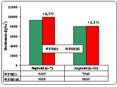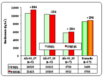 La respuesta a K fue significativa en 3 de las 17 localidades en que fuera evaluado, siendo estas 9 de Julio, General Villegas y Junín. Además, fue cuantitativamente importante en la localidad de Mercedes (2006, 2008) y en Junín (2008). Los sitios con respuesta significativa se caracterizaron por poseer textura franco-arenosa y alto nivel de rendimiento (Figura 4).