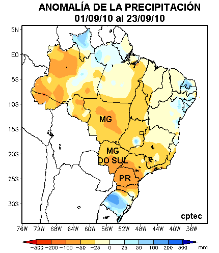 Por lo pronto, es importante decir que sobre el centro oeste brasileño el fenómeno La Niña no es considerado por los expertos brasileños como un factor de riesgo a la hora de definir deficiencias pluviales, las zonas agrícolas del sur si son más vulnerables. En resumen habrá que monitorear de cerca lo que suceda en octubre con el centro oeste de Brasil, para ver si el comportamiento de septiembre viene siendo el preaviso de un mal mayor o solo es un atraso en el inicio de la temporada de lluvias.