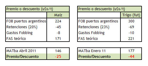Como se puede observar en el cuadro 1, los precios actualmente ofrecidos al productor en el Mercado a Término de Buenos Aires, sufren grandes descuentos con relación al precio lleno (FAS Teórico). Puntualmente, en el caso del maíz, el descuento alcanza un valor de 25 u$s /t, mientras que en el trigo 44 llega a u$s/t en las posiciones futuras a cosecha para ambos casos.