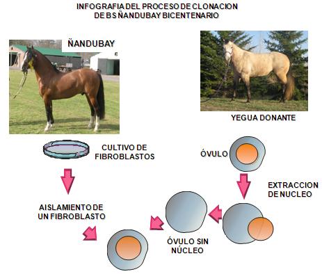 Las células aportadas por Ñandubay fueron cultivadas por los jóvenes investigadores Andrés Gambini (CONICET), Javier Jarazo y Ramiro Olivera en el laboratorio y luego fusionadas a un óvulo al que previamente se le había retirado su material genético (enucleación). La célula resultante de esta fusión celular fue activada para obtener un embrión que fue convenientemente llevado a un campo de la Provincia de Buenos Aires. Allí el Médico Veterinario Gambini realizó la transferencia del embrión al útero de una yegua hormonalmente preparada para recibirlo. A partir de entonces, la preñez fue monitoreada celosamente hasta que un mes antes de la fecha de parto la yegua preñada fue trasladada a Kawell, un centro de salud equina de excelencia. Allí, bajo la atención del Dr. César Bergadá y colaboradores y ante los emocionados ojos de los asistentes, nació BS Ñandubay Bicentenario.