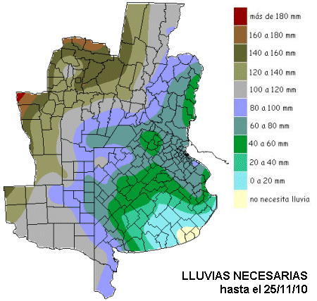 La gran mejora en las condiciones hídricas de Septiembre de las zonas secas del oeste de la región Pampeana, determinó que primero fuera beneficiada La Pampa y el oeste bonaerense y luego gran parte de Córdoba. Los trigos de La Pampa mejoraron su condición ostensiblemente, para los del centro-oeste de Córdoba estas lluvias podrían haber sido providenciales si no hubiera existido el fuerte déficit desde el otoño que impidió en muchos casos concretar las siembras. En el resto de la región el panorama triguero y del resto de los cultivos invernales es muy bueno. Ya están muy adelantadas las siembras de los cultivos estivales en especial maíz que cuenta con buenas reservas en su cama de siembra excepto en zonas como el norte de Santa Fe donde falta humedad superficial. Se está en plena siembra de soja aunque la humedad superficial es un inconveniente en algunas zonas. Se espera también una buena siembra de girasol que en años La Niña suele dar mejores resultados que la soja y el maíz.