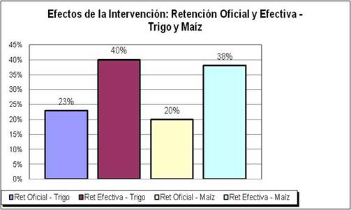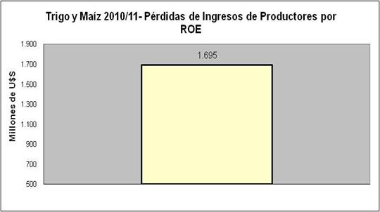 Los efectos de las políticas de intervención sobre el mercado de cereales se pueden cuantificar a nivel productor estimando cuantos recursos se le extraen por hectárea. Esto surge de contemplar lo que se le descuenta por el efecto colateral que producen los ROE. En el caso del maíz vemos que asciende a los 389 U$A/Ha tomando el rinde esperado promedio. En el caso del trigo el monto asciende a 150 U$A/Ha. A continuación un gráfico describe lo mencionado anteriormente.