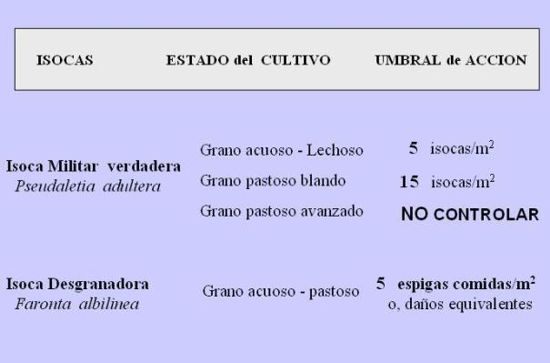 En la toma de decisiones lo importante es no dejarse llevar por el temor ante la presencia de isocas en trigo, sino tener en cuenta los umbrales poblacionales para decidir hacer o no un control químico de la plaga. A continuación se muestran dichos umbrales para ambas isocas. Vale remarcar que si el trigo alcanzó el desarrollo de grano pastoso avanzado, resultaría un gasto totalmente innecesario el control de la isoca militar temprana o verdadera cualquiera sea su cantidad presente, no así para el caso de la isoca desgranadora ya que en dicho estado del trigo todavía mantiene su potencial impacto sobre la producción.
