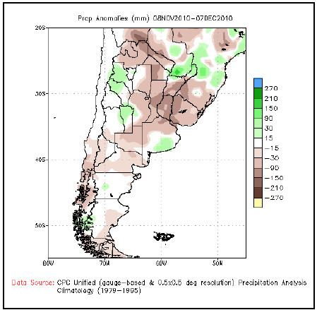 La disminución de las lluvias durante noviembre y lo que va del presente mes afectó el ritmo de la siembra particularmente en el centro y sur de Santa Fe, Norte de Buenos Aires, Entre Ríos, sectores del oeste bonaerense y del norte de Córdoba. Las anomalías en el régimen pluviométrico se reflejan en el mapa adjunto.