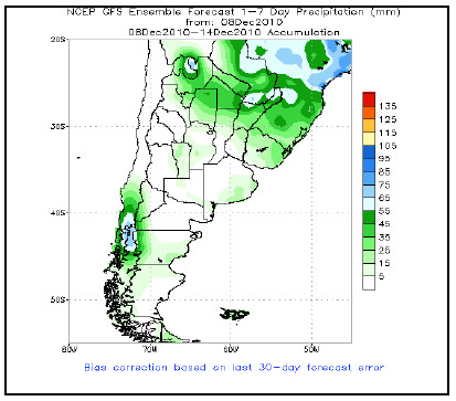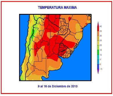 Los vientos del sector norte retornarán al área agrícola nacional, reactivando la ola de calor después del descenso térmico ocurrido en los días precedentes. A partir del 11 de Diciembre, comenzará el paso de un frente de Pampero que provocará lluvias y tormentas localizadas: La mayor parte de la Región del Chaco, Misiones, Corrientes, el norte de Santa Fe, el norte de Entre Ríos, el este de Buenos Aires, Jujuy, Salta y Tucumán, registrarán precipitaciones moderadas a muy abundantes. Sobre el noroeste y centro de Salta, el este de Jujuy y el norte de Santiago del Estero, se pronostican varios núcleos de tormentas severas con precipitaciones superiores a 100 mm. Con el paso del frente los vientos rotarán hacia el sector sur, provocando un marcado descenso térmico en la mayor parte del área agrícola nacional, con riesgo de heladas en las zonas serranas. Hacia el final de la perspectiva, retornarán los vientos del norte, reactivando la ola de calor, en la mayor parte del área agrícola nacional.