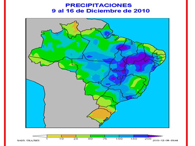Perspectiva agroclimática para Brasil del 9 al 16 de diciembre de 2010: fuertes lluvias sobre norte y centro del área agrícola, el sur recibe valores moderados