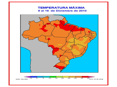 * El sudeste de Tocantis, y la mayor parte de los Estados de Bahía, Mina Gerais, de Santa Catarina, el sudeste de Tocantis, el este de Goias, y el sudeste de Sao Paulo, registrarán temperaturas inferiores a 30°C.