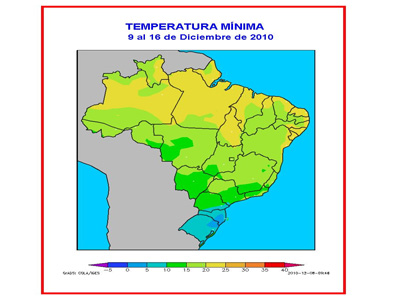* El sudoeste de Mato Grosso , la mayor parte de Mato Grosso do Sul, el sur de Goias, el sudeste de Mina Gerais, el oeste de Sao Paulo y la mayor parte de Paraná, observará mínimas entre 10 y 15°C.