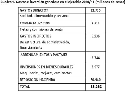 Los 83.262 millones de pesos invertidos por el sector ganadero se dividen en gastos directos, como sanidad, alimentación y personal; de comercialización (transporte y comisiones); gastos indirectos como de estructura, administración y financiamiento; arrendamientos e inversiones de bienes durables como maquinarias y mejoras. Asimismo, se consideró la reposición de hacienda correspondiente a vaquillonas, novillitos, terneros y terneras. (cuadro 1).