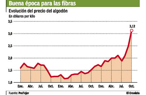 El precio internacional del algodón tocó este año su techo histórico y perfila un buen futuro para la producción nacional de fibras y textiles.