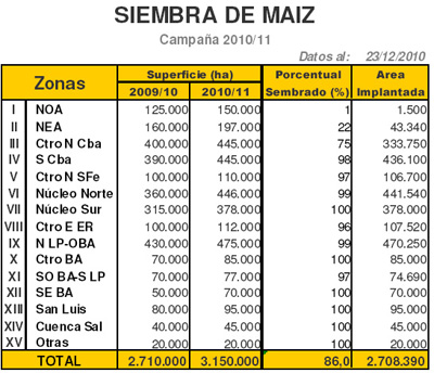 La siembra del maíz con destino a grano comercial registró un progreso intersemanal de dos puntos porcentuales, permitiendo elevar el área actualmente cultivada a más de 2,7Mhas, que representa un 86% de las 3.150.000 Has. proyectadas para la campaña en curso.