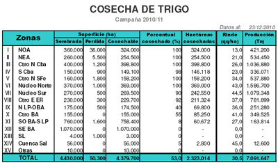 La trilla supero el 50% del área triguera a nivel nacional proyectada en 4,43 MHas, presentando un avance intersemanal del 13,6%. En números absolutos se han cosechado 2,3 M/Has., que entregaron un rinde medio de 3.050kg/ha a nivel nacional (+470kg/ha superior a la media del 2009/10 a similar fecha) y permitieron acumular un volumen parcial superior a los 7 millones de toneladas.
