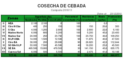 La región comprendida entre Tres Arroyos, Chávez, Dorrego y Pringles, presenta una avance de 70% del área implantada, con rindes medios de 40qq/ha. En Necochea, donde se ubica buena parte de la superficie cebadera del sudeste, el avance rondaría el 30% habiéndose relevado muy buenos rindes y de óptimas calidades.