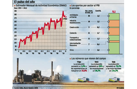 Al momento de ponderar la importancia del sector primario para la actividad económica 2010, Maximiliano Castillo, de la consultora ACM, planteó que la supercosecha sojera, y las buenas campañas de trigo y maíz, posibilitaron que el agro aportara un cuarto del crecimiento de la actividad económica. “En el fuerte crecimiento de la economía, el agro y las actividad conexas explican poco más de 2%”, planteó el economista.