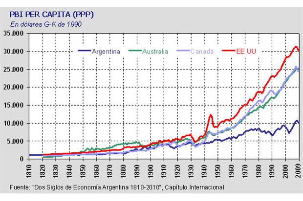 En los doscientos años de vida de Argentina, estamos relativamente bien, ya que iniciamos nuestra nación con unos 1000 dólares de 1990 per capita y hoy estamos en los 10.000, hemos crecido 10 veces y esto es bueno. Claro que cuando nos comparamos con otros países productores de materias primas ya quedamos un poco tristes: EE.UU. creció 30 veces y Australia y Canadá 25 veces. Esto nos hace pensar que tenemos que redoblar el esfuerzo para recuperar el terreno perdido, que tenemos que reunirnos en lugar de dividirnos y que cada uno debe ser más humilde y más activo para salir adelante.