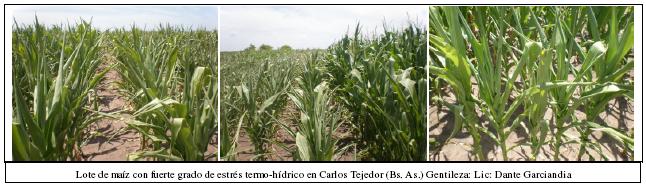 Finalmente, las perspectiv as climáticas para los próximos días no son favorables sobre la mayor parte de la pampa húmeda, donde las precipitaciones podrían ser escasas (<10mm). Contrariamente, la regiones NOA y NEA continuaran registrando recargas hídricas de abundante intensidad y solo el extremo centro-este de La Pampa y el centro y el sur de Buenos Aires, registrarán precipitaciones moderadas (10 a 25 mm). Lote de maíz con fuerte grado de estrés termo-hídrico en Carlos Tejedor (Bs. As.) Gentileza: Lic: Dante Garciandia