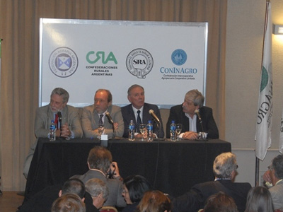 De izq. a der.: Mario Llambias, titular de CRA, Hugo L. Biolcati, titular de SRA, Carlos Garetto, titular de Coninagro, y Eduardo Buzzi, titular de FAA