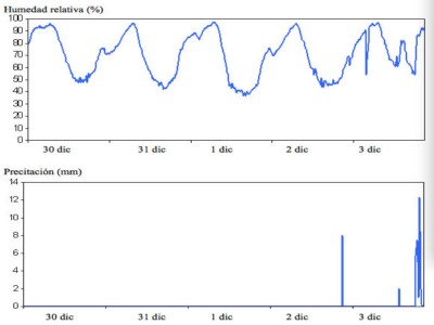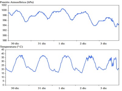 Se muestran, a modo de ejemplo la marcha de presión, temperatura, humedad relativa y precipitación en una de las estaciones ubicada en la localidad bonaerense de Henderson, entre el 30 de diciembre de 2010 y el 3 de enero de 2011: