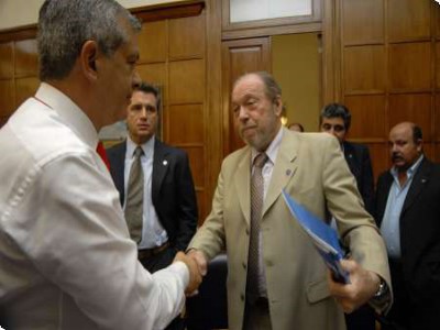 El ministro de Agricultura, Julián Domínguez, estrechando la mano al titular de SRA, Hugo Luis Biolcati, tras la reunión que mantuvo el funcionario con la Mesa de Enlace