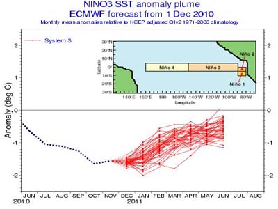 Según las estimaciones del Centro Europeo de Pronóstico, se prevé que las condiciones Niña (temperaturas de la superficie del mar por debajo de los valores normales en la zona Niño 3) se mantengan hasta mediados de este año según lo que podemos observar en la figura 1.
