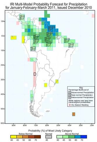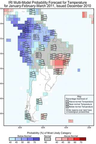 Cabe destacar que sobre el norte de la región, las temperaturas presentarían valores por encima de lo normal, resultado que no muestra el IRI pero sí el Centro Europeo para el pronóstico de mediano plazo (ECMWF por sus siglas en ingés).