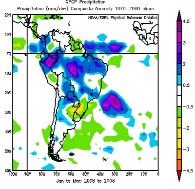 Si nos remontamos al verano de 2008, cuando el fenómeno de “La Niña” también estaba presente, encontramos que en esa ocasión las precipitaciones mostraron el patrón que se muestra en la figura 3. En ese verano, las precipitaciones se mantuvieron por debajo de lo normal sobre el centro y norte de la región Pampeana y superiores a los normales sobre el centro - sur de Buenos Aires, noreste de La Pampa y sur de Córdoba.