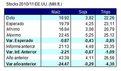 Lo primero que debemos notar es que la baja de rindes de casi 1 qq/ha en maíz provocó una merma de producción de casi 2,5 mill.tt. en la producción norteamericana, la cual se trasladó directamente a una caída en los stocks. Si bien se esperaba una caída de rindes, la misma fue mayor a lo esperado por los analistas, y en el balance final el número no resultó peor, porque un aumento en el consumo para etanol –que también se esperaba – fue contrarrestado por una disminución del consumo forrajero. En este sentido debemos señalar por un lado que de la molienda de maíz para etanol se obtiene como subproducto el destilado de granos, que se puede utilizar como forraje, y que por otro lado la suba de precios que también experimenta la carne en EEUU estar ía reduciendo el consumo.