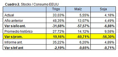 Si recapitulamos en el cuadro 2 como queda el ratio stock/consumo comparado contra los históricos, podremos tomar dimensión de lo ajustada que está la situación del maíz y la soja, y de que en trigo si bien todavía hay una situación holgada, esto se viene ajustando fuertemente.