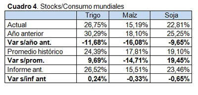 Si tomamos entonces en cuenta que estos números internacionales que publica el USDA podrían estar inflados por el lado de la oferta, e incluso estar subestimando la demanda, concluimos que el cuadro 4 que muestra las relaciones de stocks/consumo internacionales, en una situación todavía más ajustada que la anterior para maíz y soja, en niveles ya preocupantes, y una situación de trigo abundante pero reduciéndose, podría incluso ser peor, y justifica el escenario elevado de precios que estamos observando actualmente.