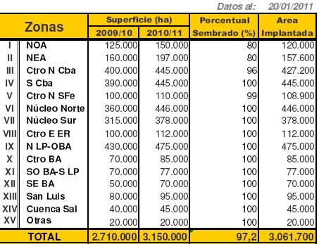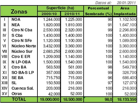 más que la pasada campaña. En este incremento influyo en gran medida el aumento en la superficie sembrada en las provincias de Córdoba, Santa Fe, Chaco, Santiago del Estero, Salta y Tucumán, sumado a las muy buenas productividades que se fueron dando en el núcleo triguero y periferias. Por lo cual no solo creció el área implantada con el cereal si no que se elevo el promedio de rinde en 700kg/ha (de 2.700 kg/ha en 2009/10 a 3.450 kg/ha en 2010/11).