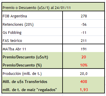 Con una producción estimada de 20 millones de toneladas, para la campaña 2010/11, los U$S 20, suman U$S 408 millones transferidos desde el sector productor a los consumos internos y a los exportadores. Este importe equivale a 1,93 millones de toneladas de maíz que entregan gratuitamente los productores a la industria y a la exportación.