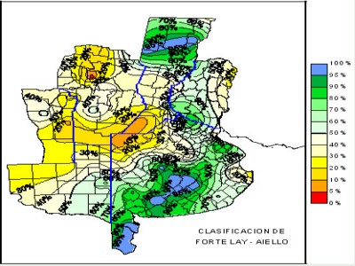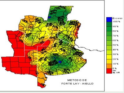 Considerar en sequía absoluta las áreas con 0% de agua útil, en sequía condicional las áreas entre 0 y 50% de agua útil y en humedad óptima las áreas entre 50 y 100% de agua útil.