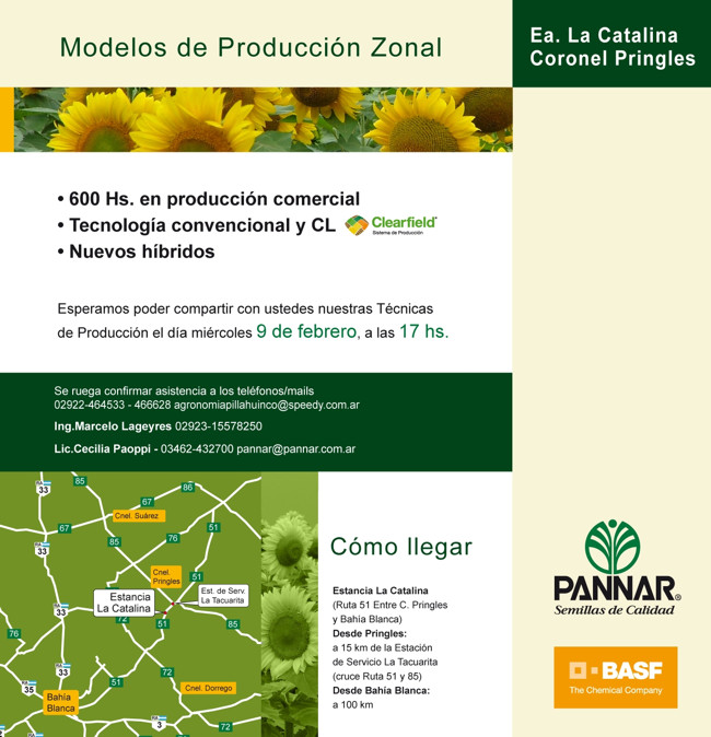 El miércoles 9 de febrero a las 17, PANNAR realizará una jornada en la Estancia La Catalina Ruta 51 Km. 641, Coronel Pringles provincia de Buenos Aires, en donde se presentarán sus Técnicas de Producción de Girasol adaptadas a la zona.