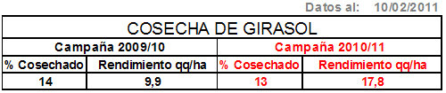 En el NEA reiteradas precipitaciones ralentizan las labores de trilla. En Las Breñas y Charata los abundantes registros hídricos de las últimas semanas ocasionan anegamiento y podredumbre de capítulos, perjudicando el rendimiento y la calidad del grano. En la zona el rinde medio es de 17qq/ha. Hacia Sáenz Peña, Quitilipi, Machagai la producción unitaria asciende a 19qq/ha. En Bandera (Santiago del Estero) los daños producidos por la paloma son de alta incidencia (hasta 50 %) ubicando el promedio de rendimiento en 12qq/ha.