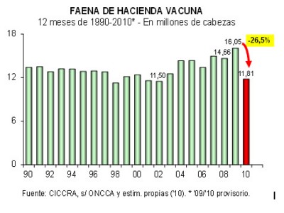 Tal como lo señalara en Informes anteriores, CICCRA explicó que lo que sucedió en 2010 era fácil de prever, debido a que “desde el otoño de 2006 en adelante el gobierno nacional implementó una política anti-ganadera, la cual le restó sentido económico a la cría de hacienda. Sólo era cuestión de tiempo que esto se reflejara en los mercados de hacienda y de carne vacuna. Probablemente la fuerte sequía que afectó a las zonas productoras entre mediados de 2008 y de 2009 contribuyó a demorar la aparición de los efectos de una política sectorial nefasta, porque forzó la venta anticipada de animales ante la falta de alimento y agua. Pero, más tarde o más temprano los resultados iban a quedar a la vista.