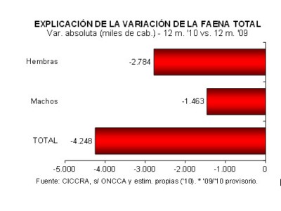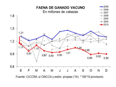 La Cámara de la Industria y comercio de carnes y derivados de la Republica Argentina (CICCRA) publicó su Informe Económica Nº 121, en el cual realizó un balance del sector ganadero en el 2010, y tomó determinados indicadores económicos sectoriales tales como la faena, la producción de carne y las exportaciones.