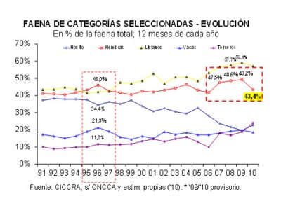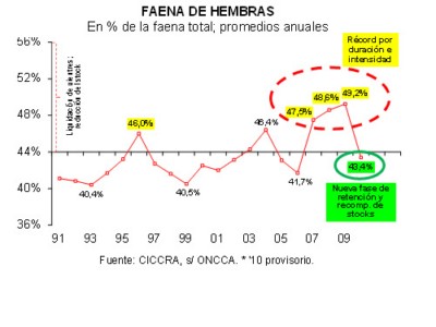 La participación de las hembras en la faena total descendió a 40,1% en diciembre de 2010. Esto nos confirma que el proceso de retención de vientres que se inició a mediados de 2010, sigue en marcha y, además, que se intensificó a partir de la nueva primavera (al bajar de 41,7% en el tercer trimestre a 40,3% en el cuarto trimestre del año)”.