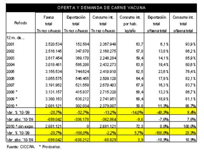 En términos absolutos, CICCRA indicó que la mayor porción del ajuste recayó en el mercado doméstico (-362.864 tn r/c/h). Pero, en términos relativos el mercado externo fue el que soportó el ajuste más importante. Porque las exportaciones cayeron 52,7% en términos anuales y el consumo doméstico sólo retrocedió 13,2%. De esta forma, la participación de los envíos al exterior en el total de producción bajó de 18,9% en 2009 a sólo 11,3% en 2010, marcando el peor registro de la década, si se deja afuera del análisis al particular 2001 (cuando, debido a la reaparición de la fiebre aftosa en los rodeos, se produjo el cierre masivo de mercados externos).
