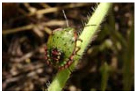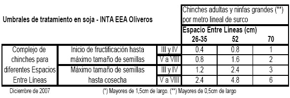 Se registran ataques del complejo de chinches en soja de primera. Recordamos que las chinches succionan los granos en formación por medio de su aparato bucal chupador. Las picaduras del insecto impiden el normal desarrollo de semillas chicas, originando vainas vacías. En semillas de mayor desarrollo, causan deformaciones, necrosis y manchas oscuras. En los cultivos con alta infestación de chinches, los ataques muy severos producen el fenómeno de retención foliar, permaneciendo las hojas en las plantas hasta que se produce su caída por efecto de las primeras heladas.